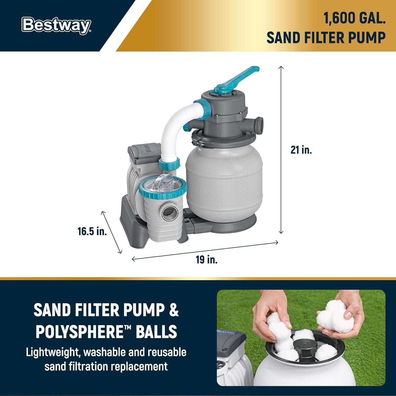 - Accessories: Includes a 1,600 GPH sand filter pump, 250 grams of Polysphere pool filtration balls (washable, reusable sand filtration replacement), a ladder, pool cover, and a repair patch.