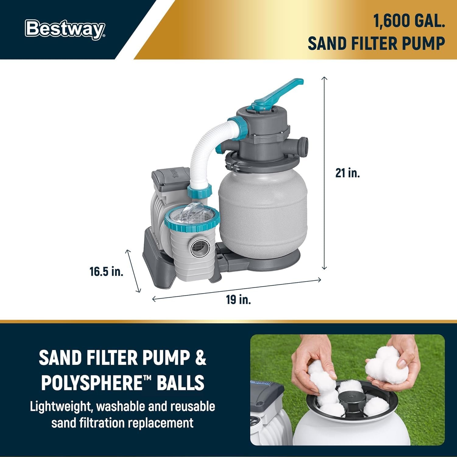 - Included Accessories: Includes a 1,600 GPH sand filter pump, 250 grams of Polysphere pool filtration balls (washable, reusable sand filtration replacement), a ladder, pool cover, and a repair patch