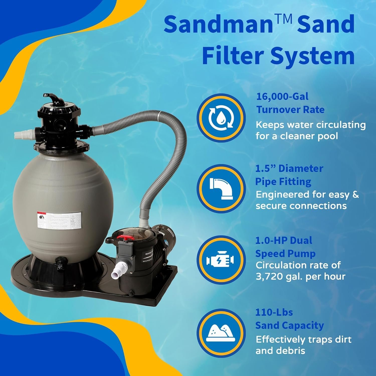 - Includes liner, pump and sand filter system, A-frame entry ladder, and wide-mouth skimmer