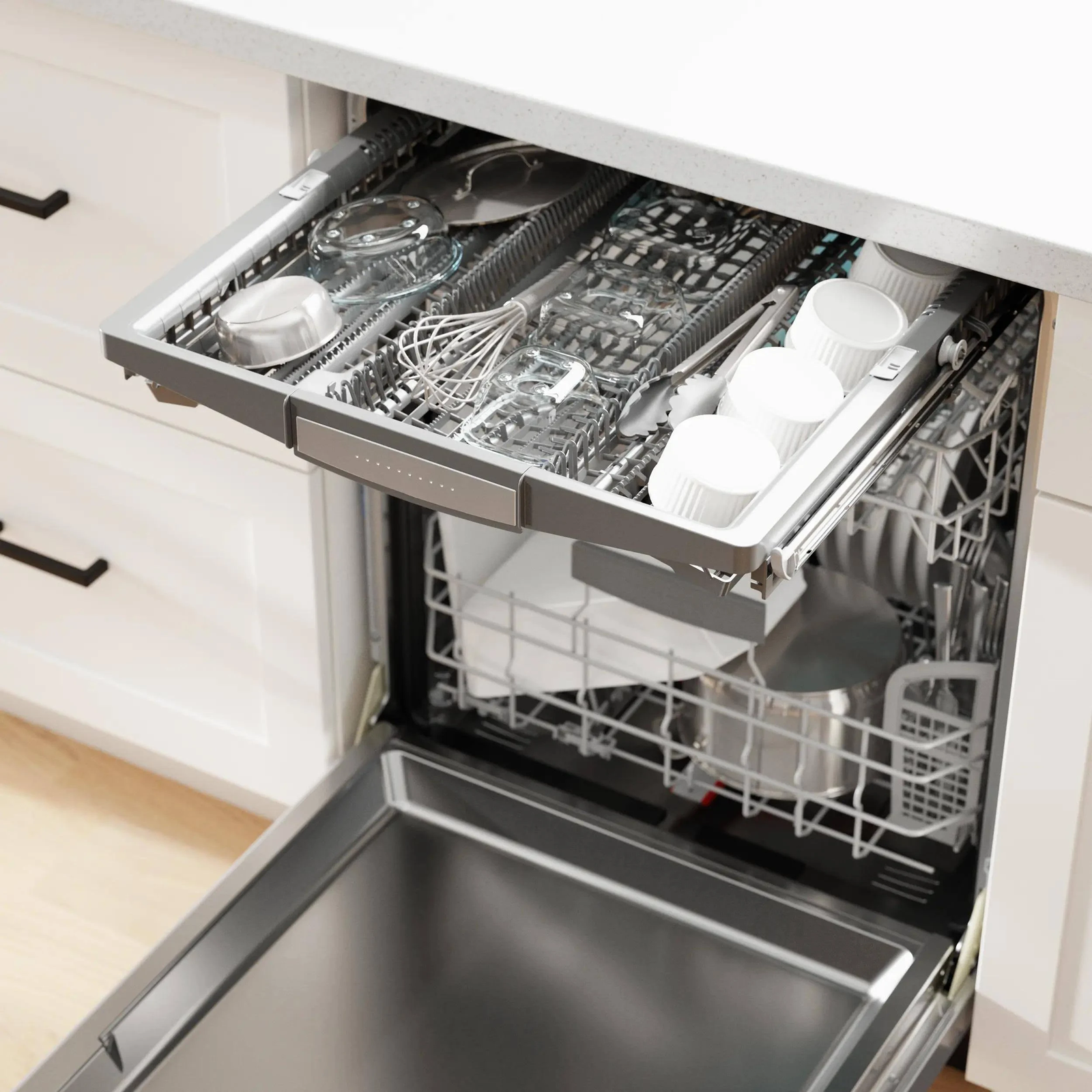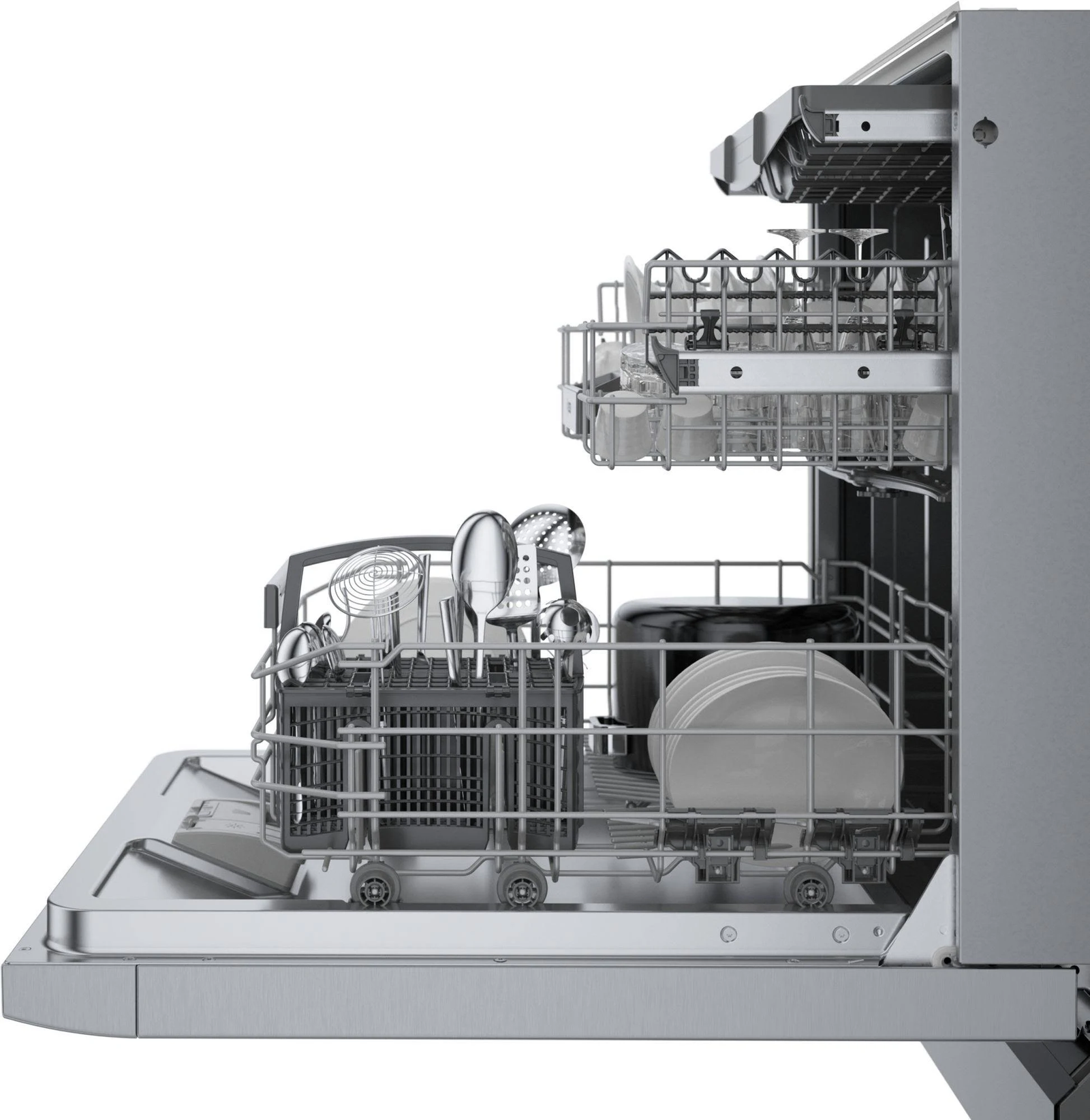 - RackMatic: adjusts the upper rack to 9 different positions, allowing for taller items like stemware or leaving room for pots and pans below.