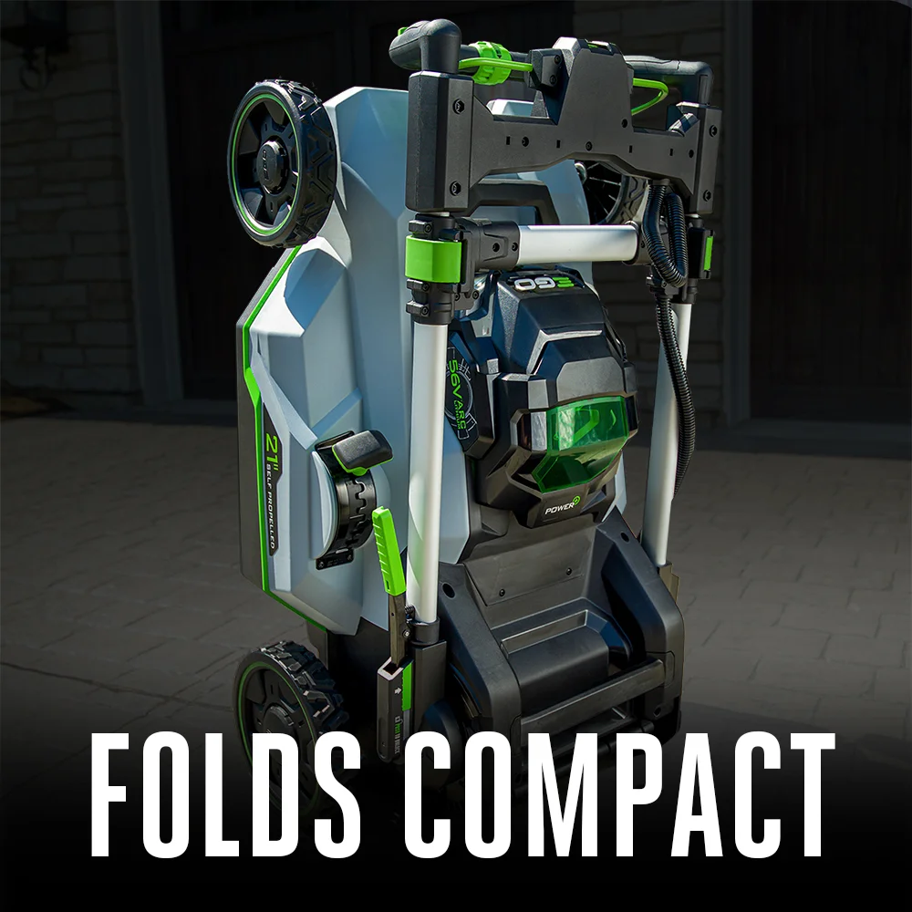 The EGO POWER+ 21″ Select Cut Self-Propelled Mower delivers up to 7.0 foot-pounds of torque for performance that exceeds the power of gas. The Select Cutâ„¢ Multi-Blade Cutting System is equipped with three interchangeable lower blades: the Mulching Blade, High Lift Bagging Blade, and Extended Runtime Blade. The Mulching Blade comes installed on the lawn mower and is ideal for weekly mulching, giving you the mulching quality expected from a high-end gas lawn mower. The High Lift Bagging Blade provides extra suction ideal for bagging, leaving your yard free of clippings. The Extended Runtime Blade provides an optimal balance of cut quality and runtime for all around performance. All three blades can be used interchangeably based on your desired cut. The Upper Blade is used in combination with the lower blade chosen to slice the grass into fine fragments, greatly enhancing cutting performance with all grass types. EGO Touch Driveâ„¢ self-propelled technology puts complete control of the self-propel system in the palm of your hands by using pressure to engage the system. Easily control the variable speed with a dial positioned at your fingertips for safe and convenient operation. The Select Cutâ„¢ cordless lawn mower harnesses the power of the industry’s most advanced 56V ARC Lithiumâ„¢ batteries to deliver up to 60 minutes of runtime on a single charge with the recommended 7.5Ah battery. Three-in-one functionality delivers your choice of mulching, side discharge, or bagging your grass clippings; an easy-access two-bushel grass collection bag is included. This electric lawn mower includes bright LED lights for added visibility when mowing at dawn or dusk, and it folds for compact storage between cuts. Experience Power Beyond Beliefâ„¢ with the EGO POWER+ 21″ Select Cutâ„¢ Self-Propelled Lawn Mower.