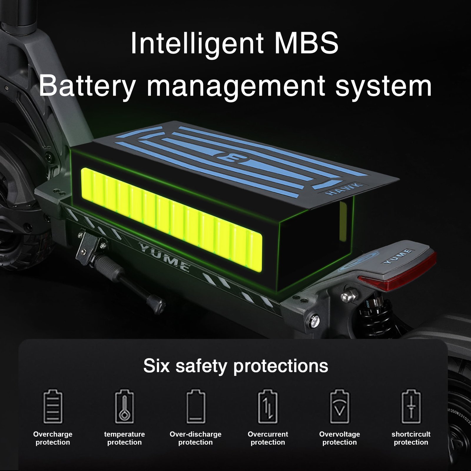 YUME HAWK sports an EV-grade battery using 21700 cells with a total capacity of 60V 22.5Ah and averages 45 miles in range with full charge (terrain dependant). The scooter also supports dual charging.