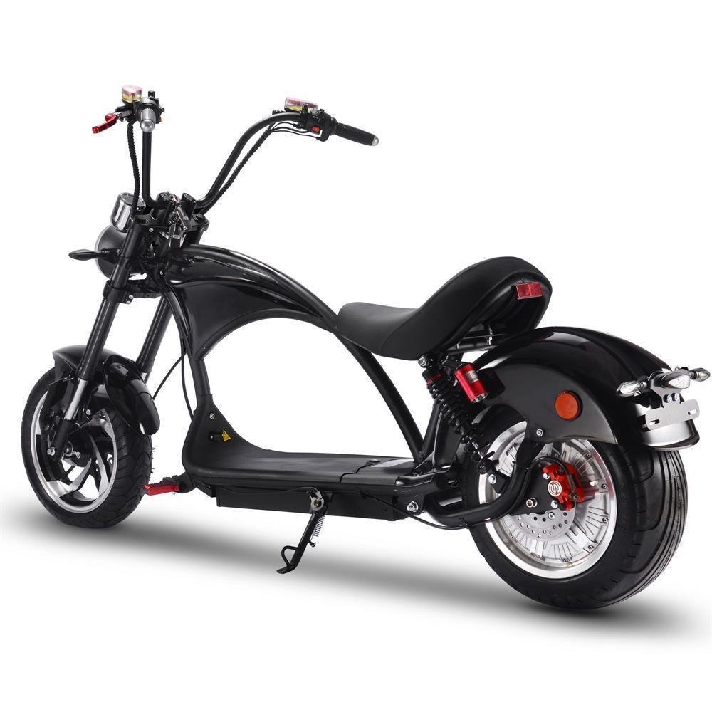 This electric motorcycle is very comfortable, featuring a low and long wheelbase and a big padded seat. The fat motorcycle tires do a very good job of cushioning the ride and improving grip. The scooter has a range of around 25 to 38 miles, so you can go on lengthy off-road adventures or road trips. The MotoTec Lowboy is a great choice for a daily ride to work or school.