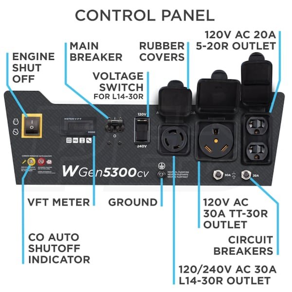 Product SpecsVoltage120/240 Single-PhaseFrequency60 HertzAlternatorBrushAuto Voltage RegulationYesRated Watts5300 WattsSurge Watts6600 WattsFuel TypeGasolineRated Amps22 AmpsPortability KitNever Flat WheelsTank Size4.7 GallonsRun Time @ 50% Load11 HoursFuel Tank MaterialMetalFuel GaugeYesIdle ControlNoHour MeterYesVoltage MeterYesBatteryNot ApplicableGrade TypeEmergencyCO SensingYesLow THDNoEngineEngine BrandWestinghouseStarting SystemRecoil StartCC274 CCEngine RPM3600 RPMLow Oil Alert/ShutdownYesCast Iron SleeveYesPlugsNEMA 5-20R – Wall-Type1NEMA L14-30R1RV Ready 30-Amp1